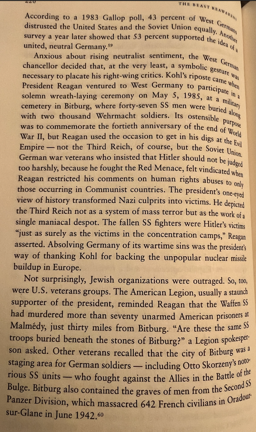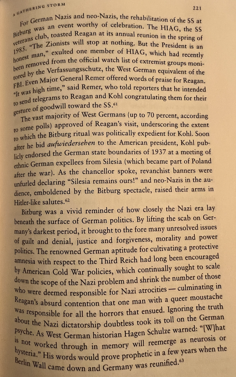 The scope of this book is kaleidoscopic, but topics covered include the role of Third Reich figures and their collaborators in NATO's "stay behind" GLADIO program, the often-ignored support networks fostered between American skinheads and their West German counterparts in the 1980s and 1990s, and the Reagan Administration's utilization of far right elements in their anti-Communist crusades. Oh and you'll never look at Germany's political class the same after this. Below are a few pages to give an idea of what you'll encounter: Reagan commemorating an SS graveyard in Germany, alongside Chancellor Helmut Kohl.